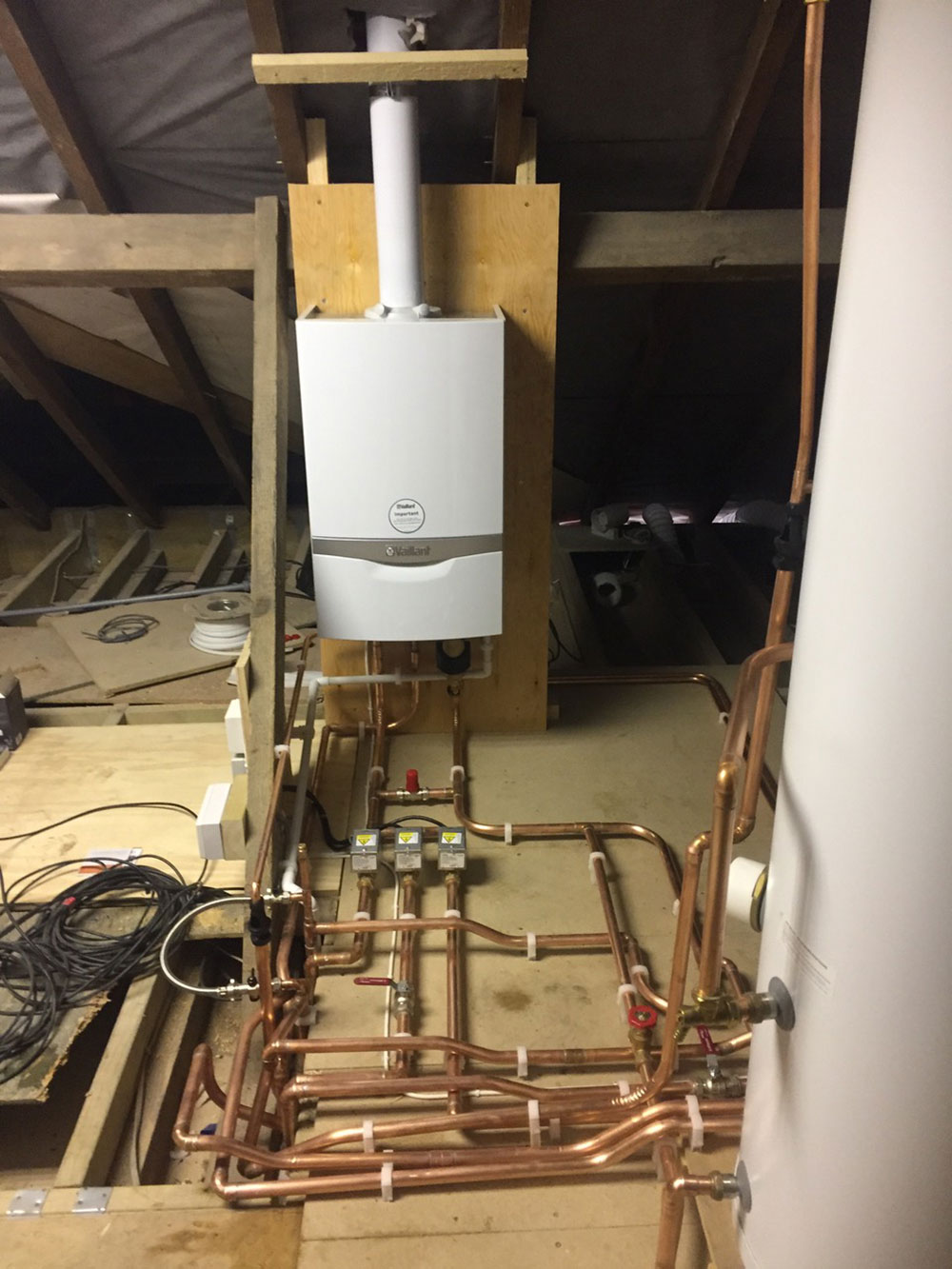 Vaillant ecoTEC Plus 624 boiler installed and 210l unvented cylinder installed in Dartford, Kent. Honeywell Zone valves and magnetic filter fitted. Vertical flue through roof.