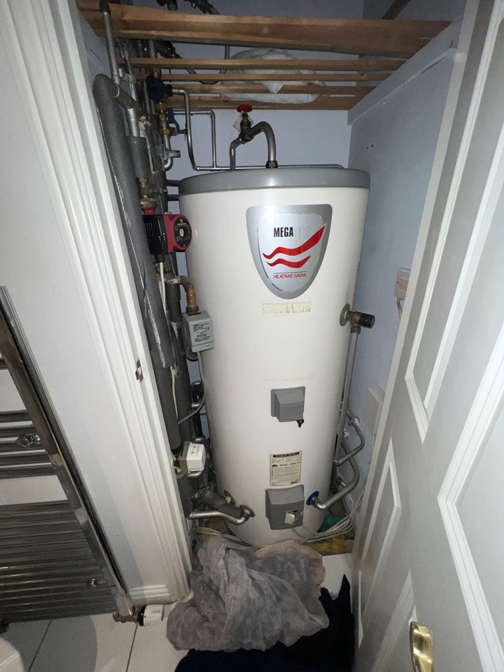 Leaking unvented Mega Flo cylinder leaking in Greenhithe, Kent. Removed cylinder, renewed damaged flooring, fitted new Stelflow unvented cylinder, new Honeywell zone valve, grundfos pump, new heating pressure vessel & filling loop. Fitted HIVE programmer.